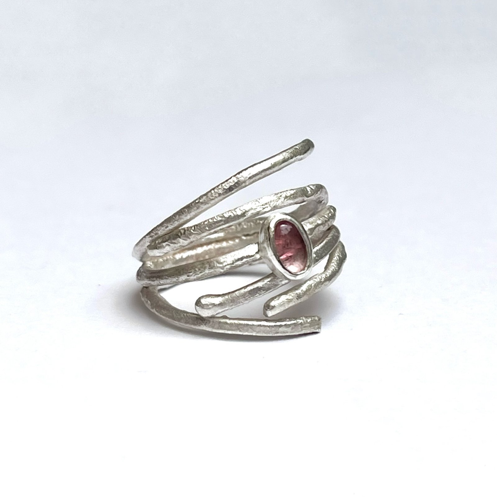 «La joya que se adapta a ti. He diseñado el Anillo Abrazo como una pieza que no solo decora, sino que se integra con tu movimiento. Forjado en plata 950 con fuego directo, la textura resultante evoca elementos naturales, creando un contraste perfecto con la suavidad y el color vibrante de las piedras.
