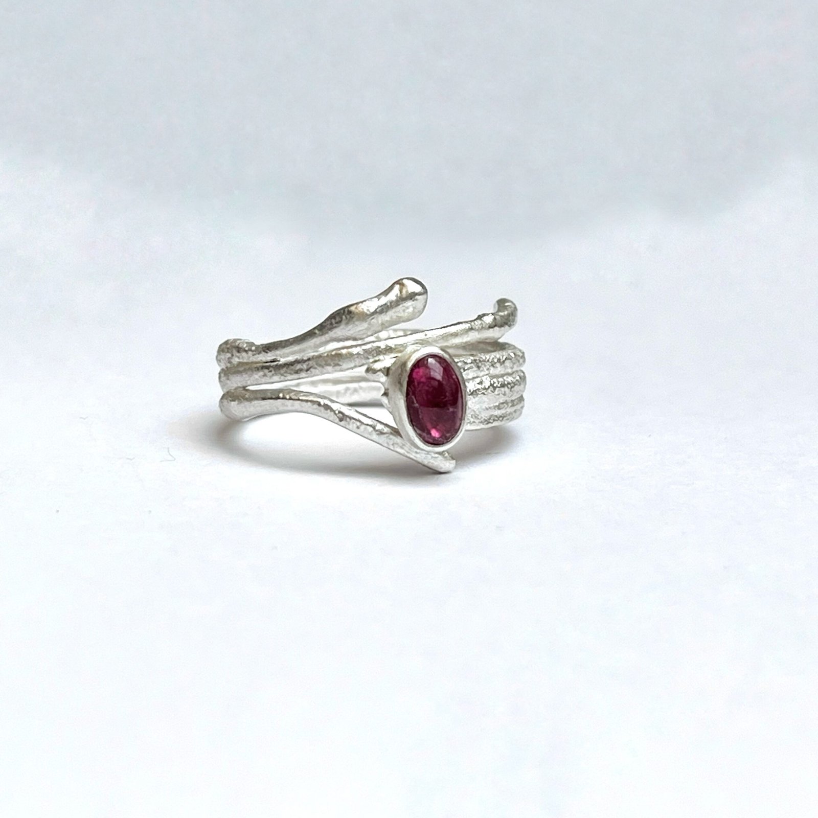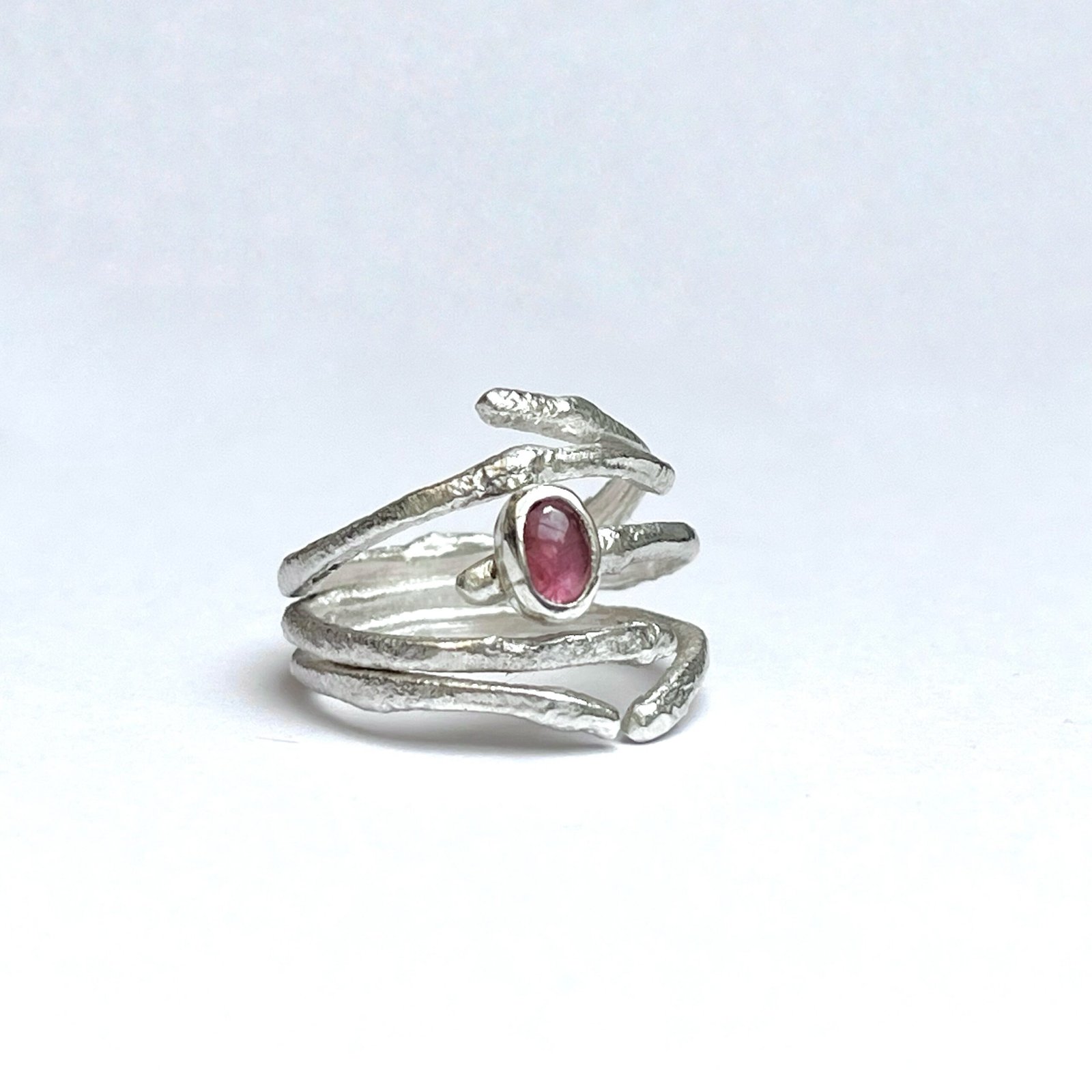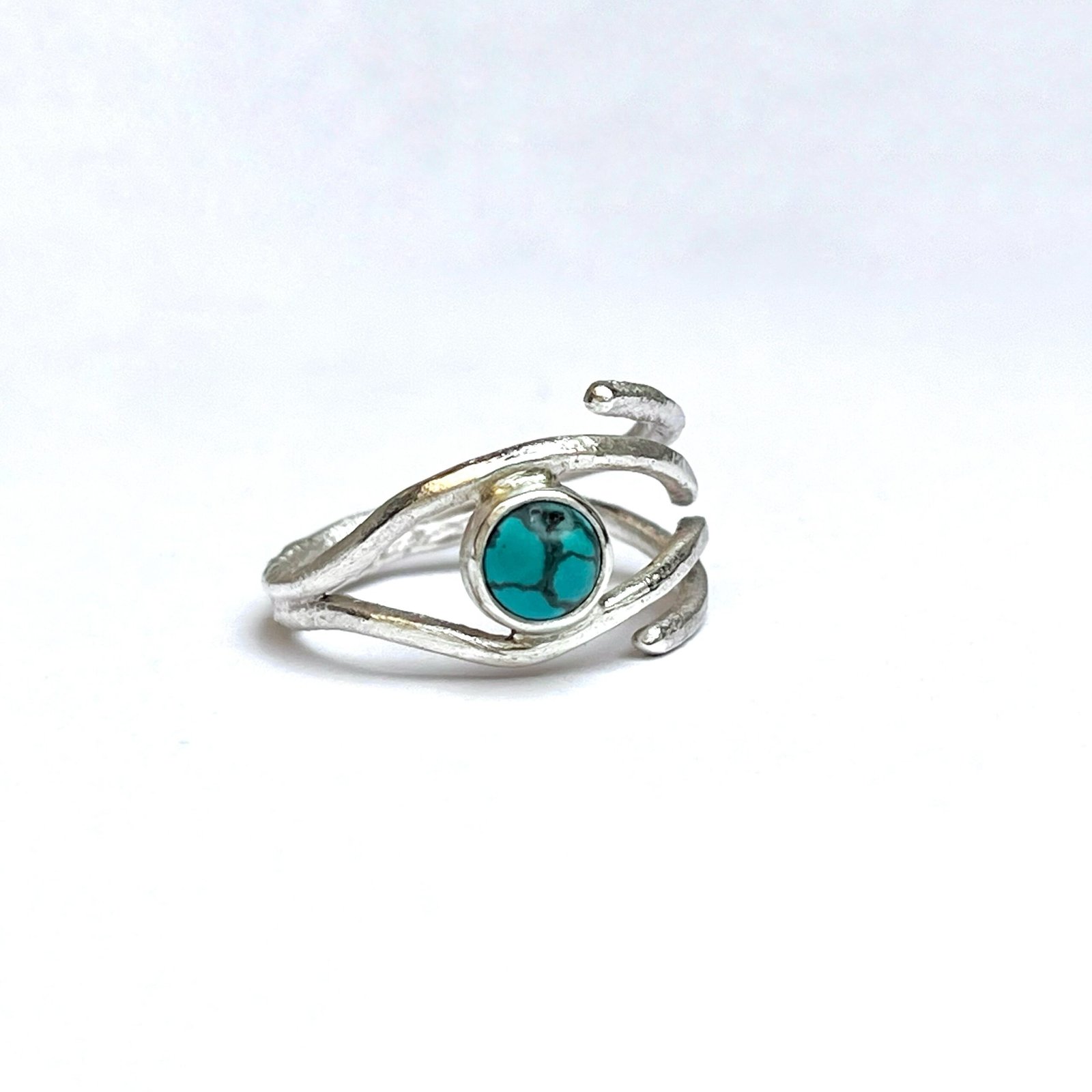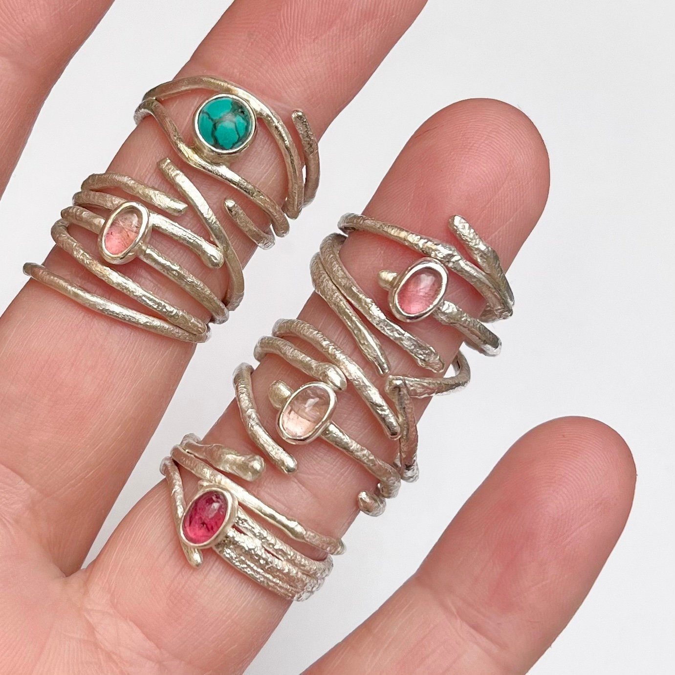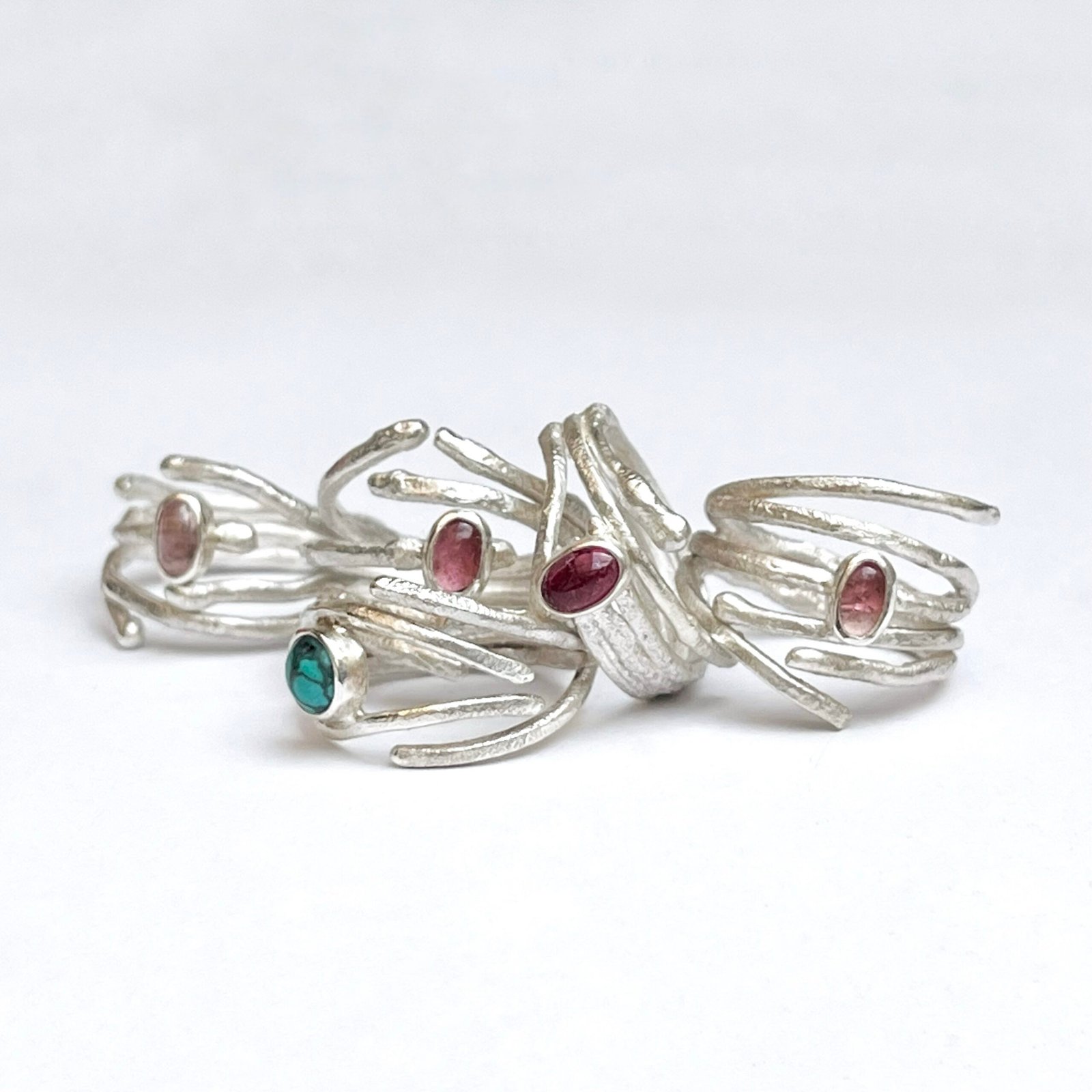 Cada anillo es una pieza de autor, abierta y ajustable para brindar total comodidad sin perder su carácter escultural. La Turmalina, con su espectro de colores, o la profundidad terrenal de la Turquesa Tibetana, se convierten en el centro de atención de una pieza pensada para durar toda la vida. Un abrazo de plata que cuenta tu propia historia.»
