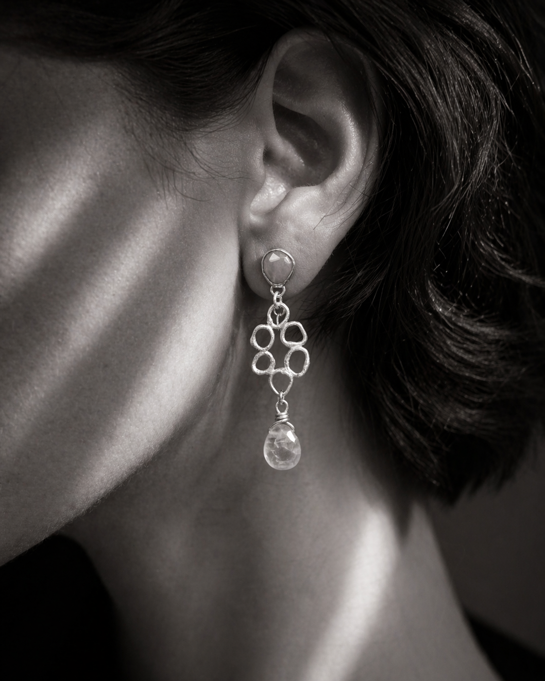 «El arte se encuentra con la alegría en estos aros de diseño único. He forjado una cascada de ‘burbujas’ orgánicas en plata 950, creando una composición dinámica y liviana que danza con cada paso. Evoca la espuma lúdica de las olas al romper en la orilla.