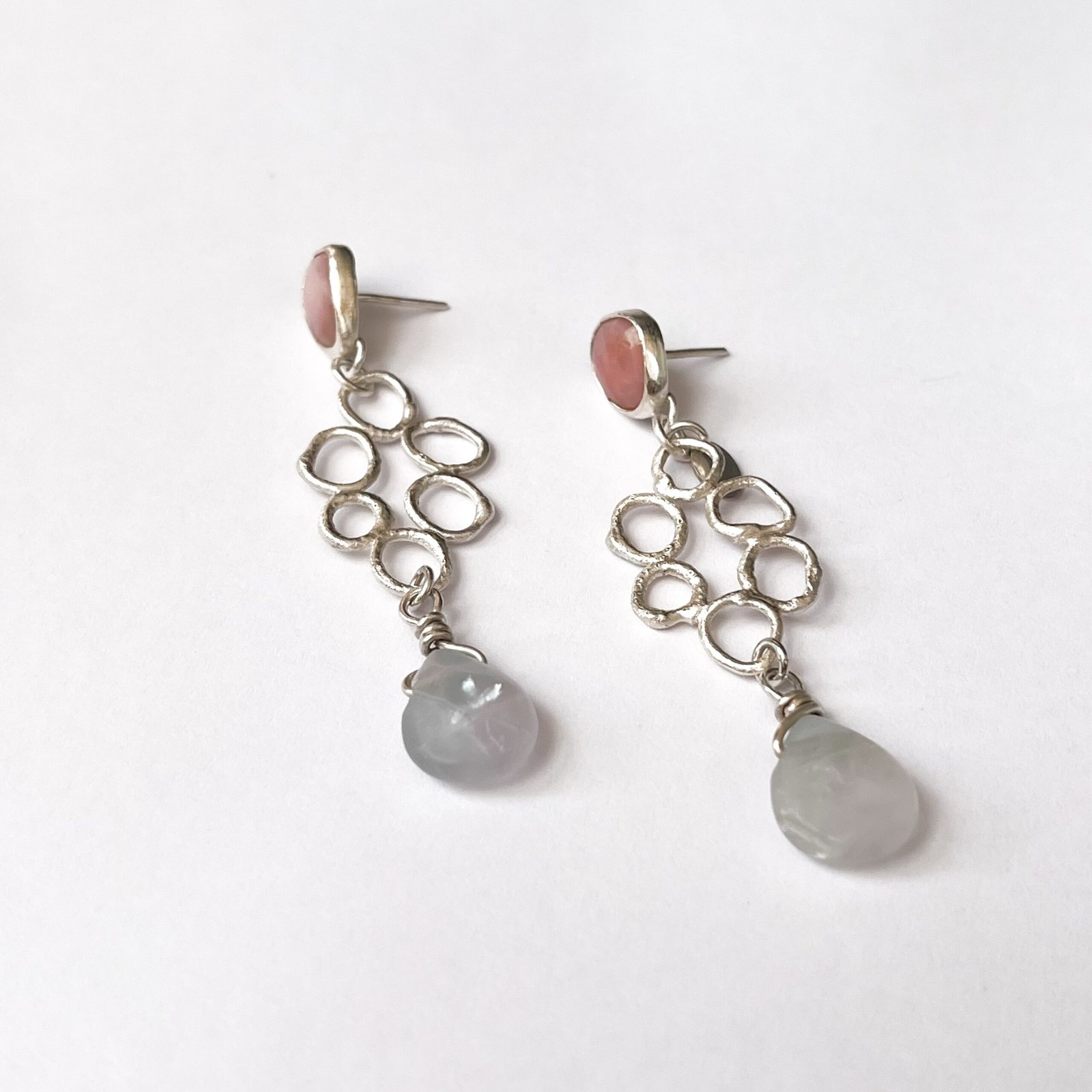 De esta composición vibrante emergen, en perfecto equilibrio, dos joyas de luz. Un ‘stud’ de Ópalo Rosado, con su tono suave y reconfortante, corona la pieza. Y como una gota de mar cristalino capturada al vuelo, cuelga una Fluorita natural, seleccionada por su brillo sutil y su forma orgánica.»