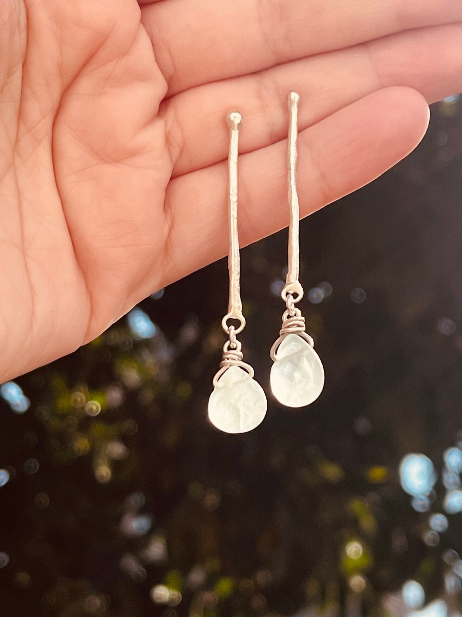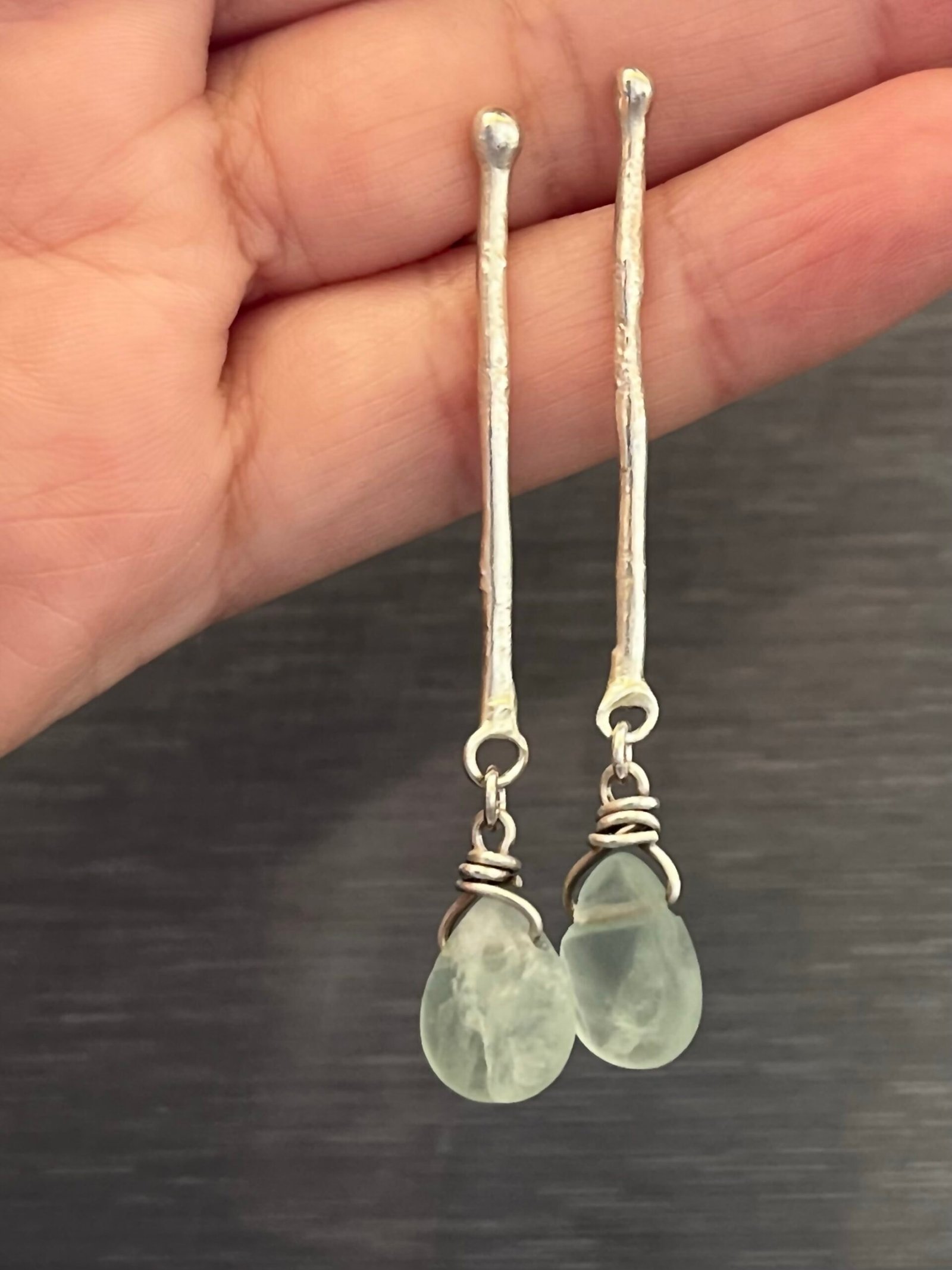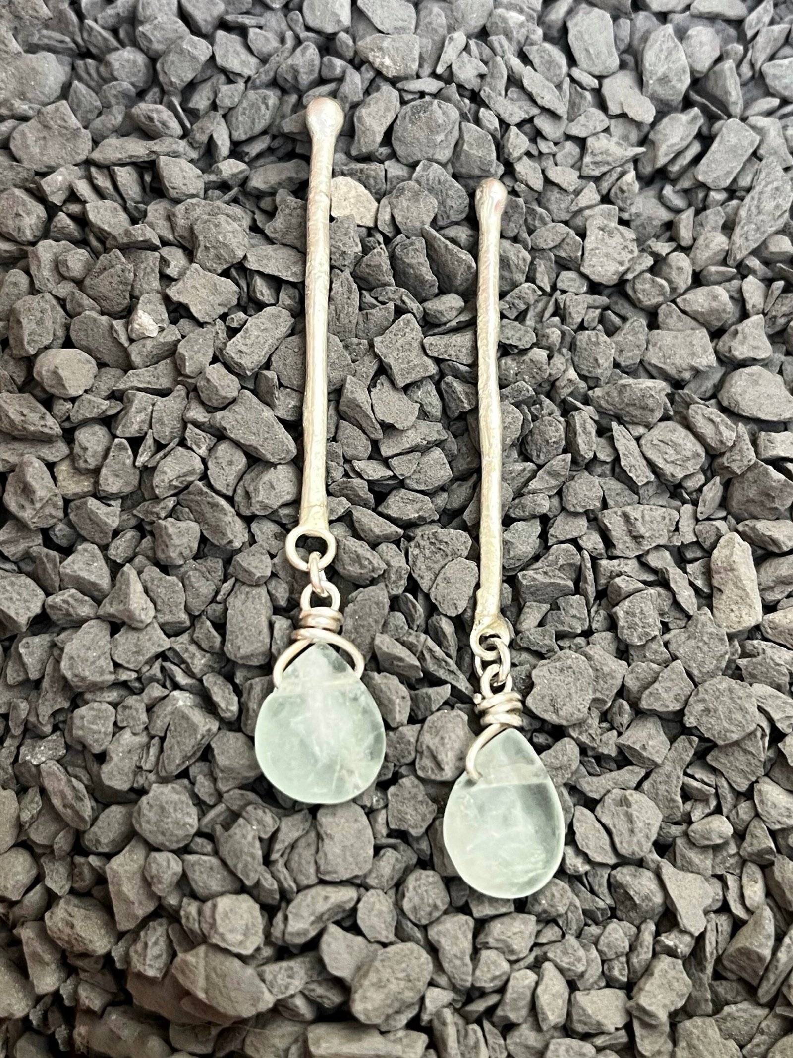 «La frescura del mar, la simplicidad de la tierra. Estos Aros Minimalistas son un diálogo entre la simplicidad de la plata texturizada a mano y la belleza etérea de la fluorita natural. Dos gotitas de fluorita en un tono menta suave, con su característica forma orgánica, cuelgan delicadamente de dos barritas de plata, creando un diseño etéreo, natural y lleno de vitalidad.