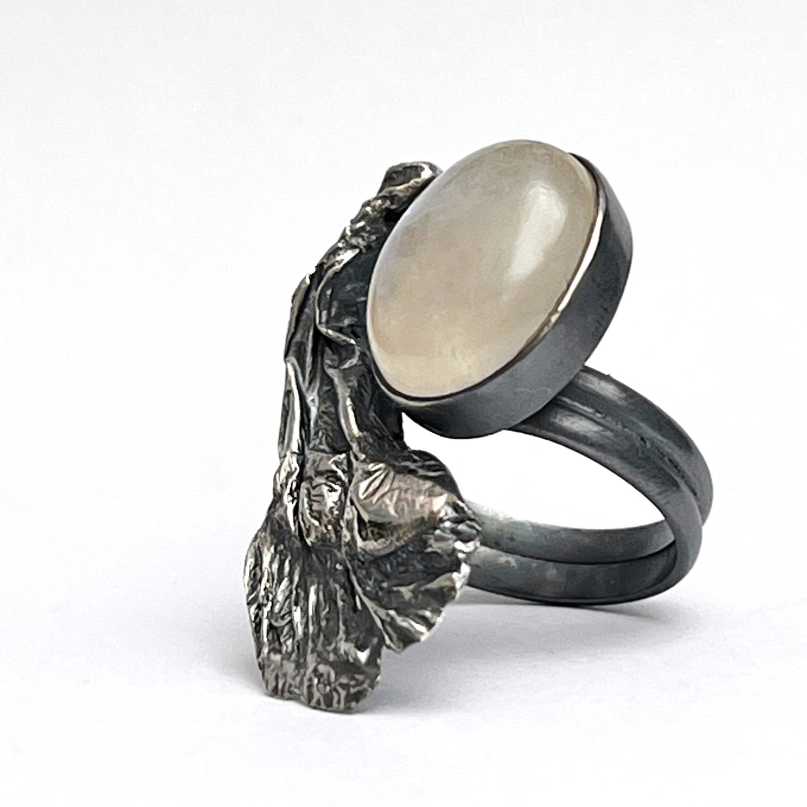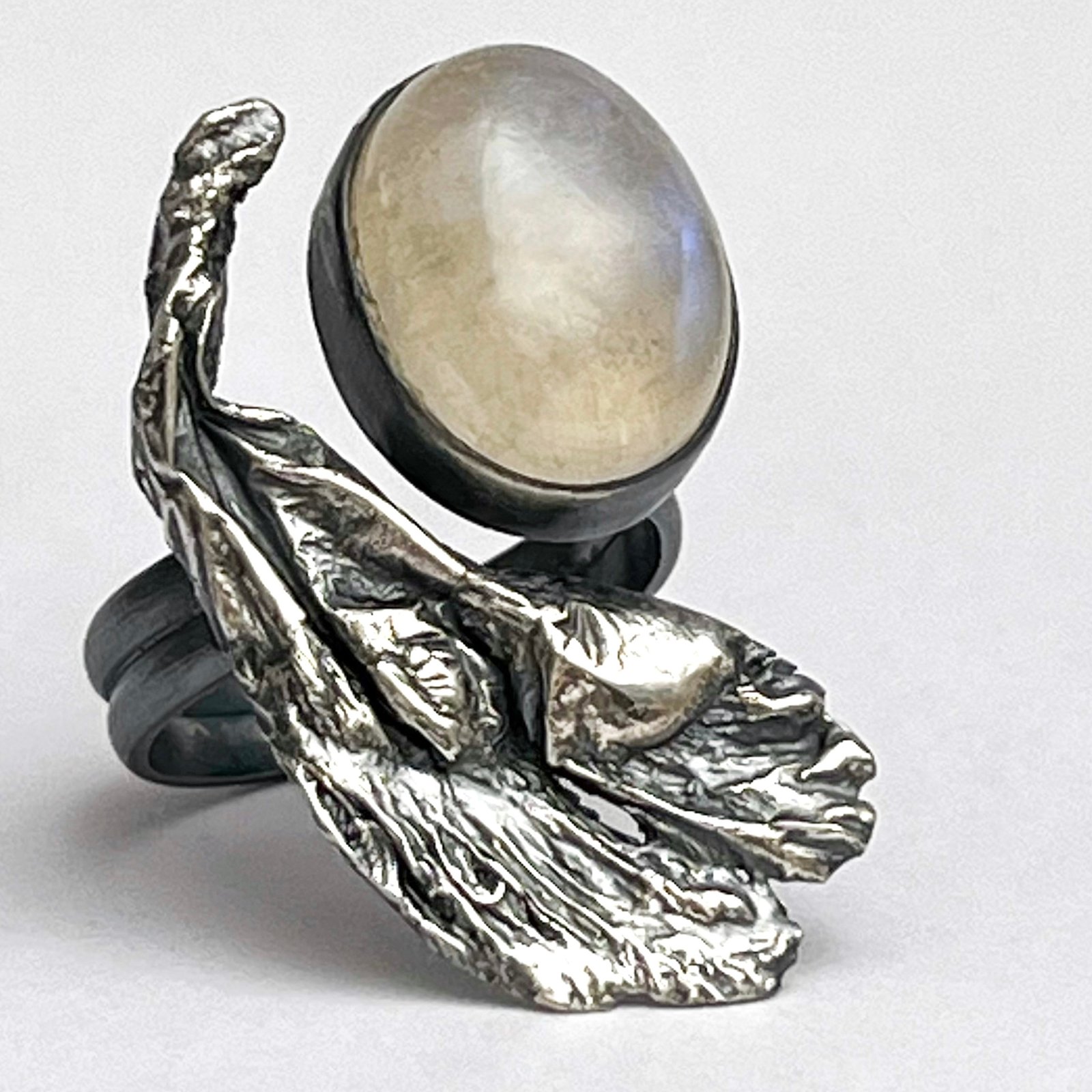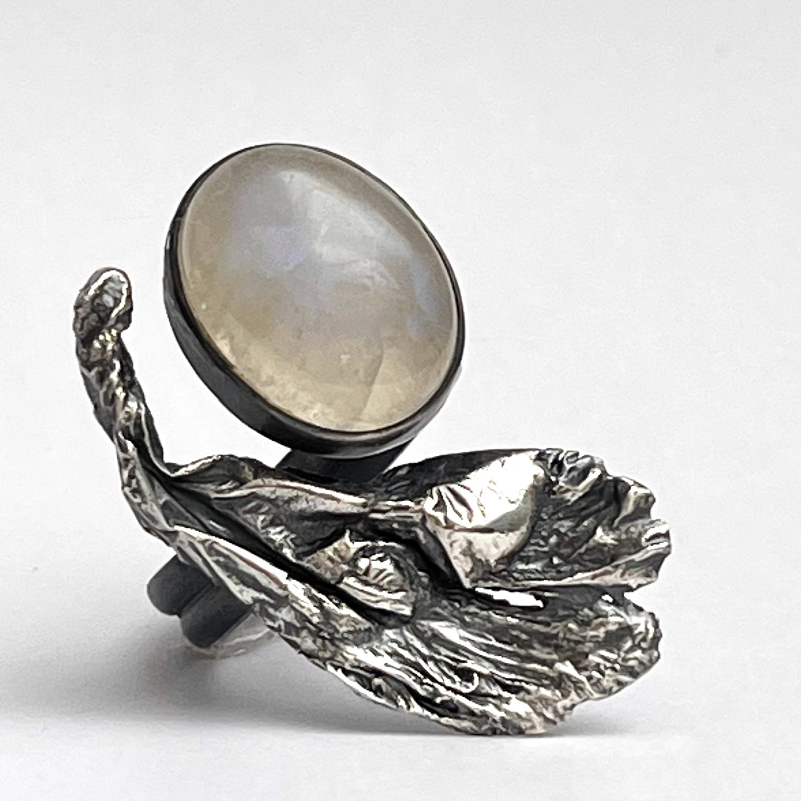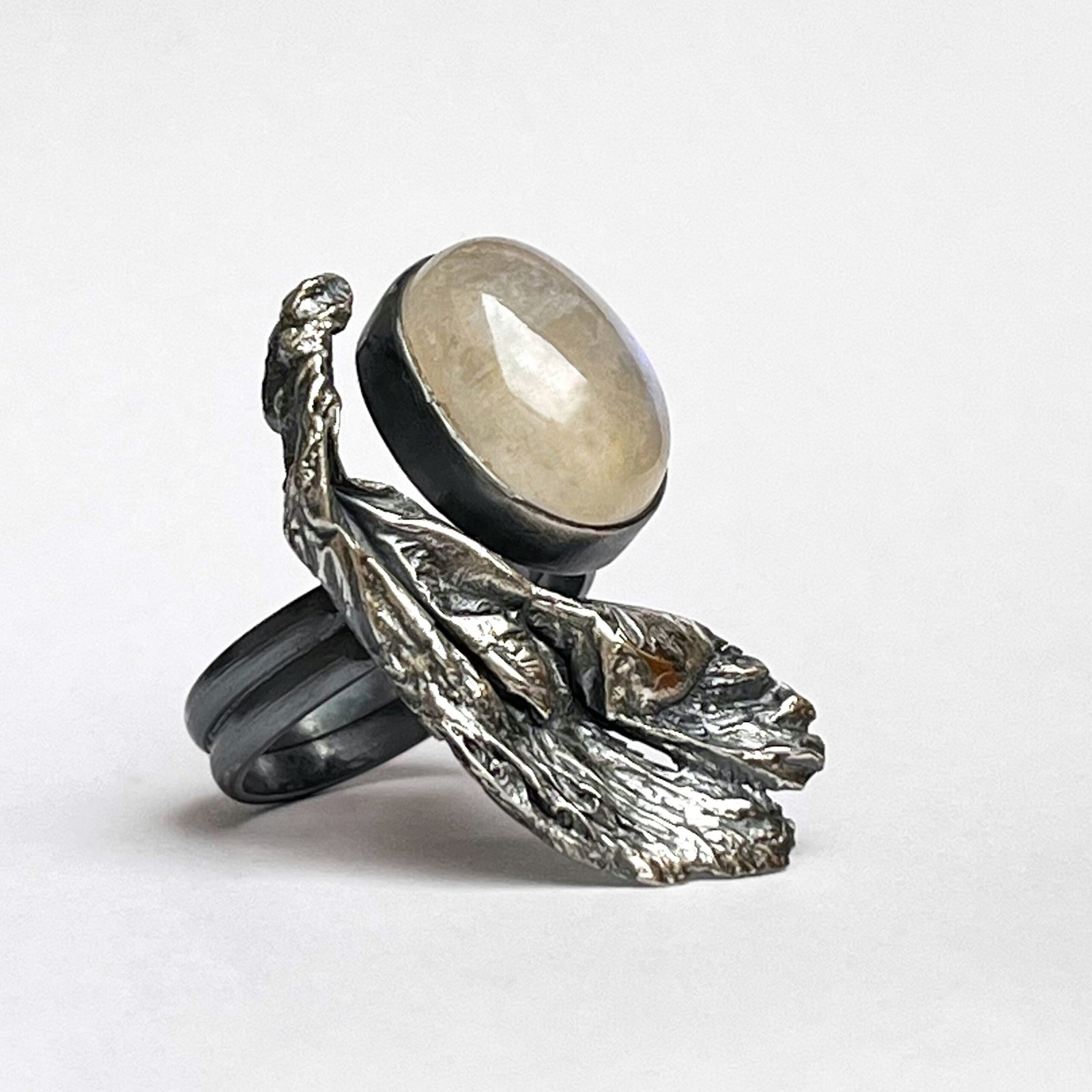 Modelado a fuego en plata con una pátina negra profunda que evoca la noche, abraza una Piedra Luna natural de destellos azulados. Es un recordatorio de que, incluso en nuestra búsqueda de la perfección, somos seres cíclicos, sensibles y poderosos como el mar.»