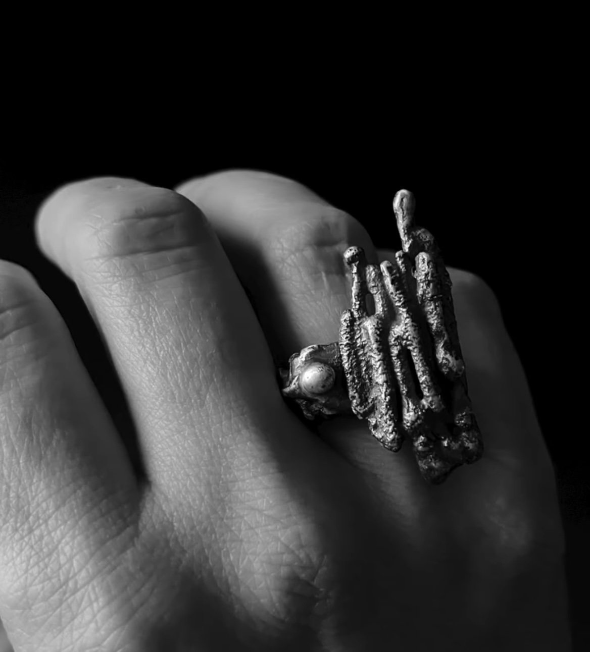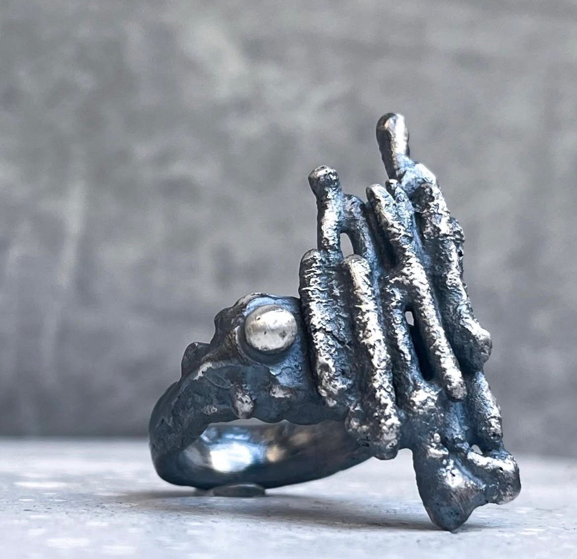 «Anillo escultórico de autor, forjado macizo en Plata 950 con pátina negra. Una pieza de diseño único que transforma la joyería en arte portable.»