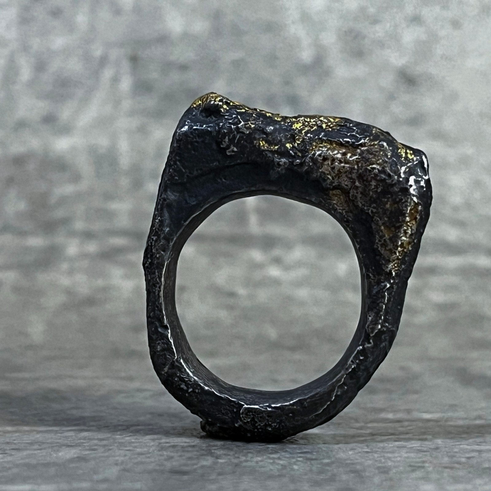 «Anillo robusto de plata con meseta irregular y aplicación de oro de 24k mediante técnica keum-boo. Una pieza de autor con textura orgánica y contraste de alto lujo.»