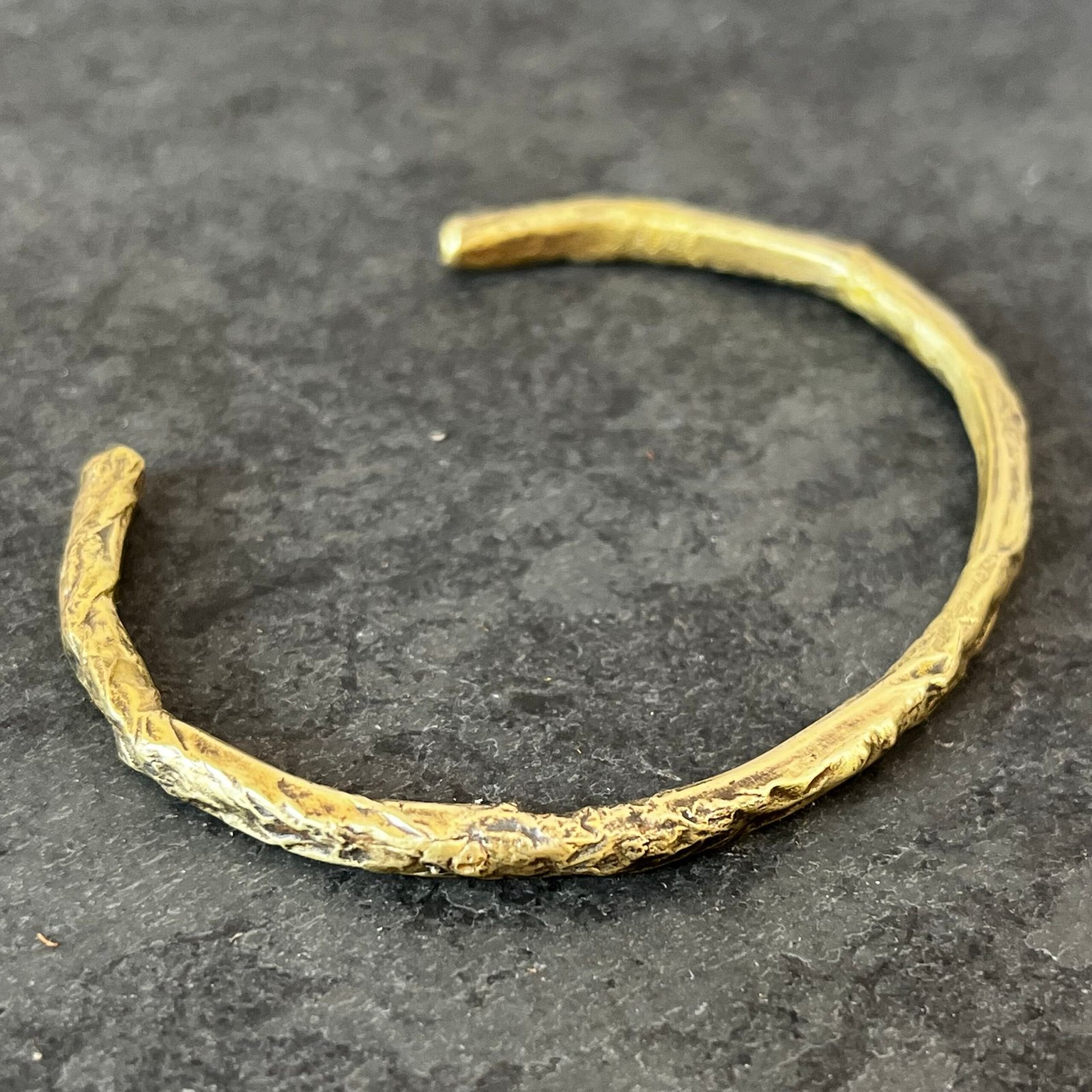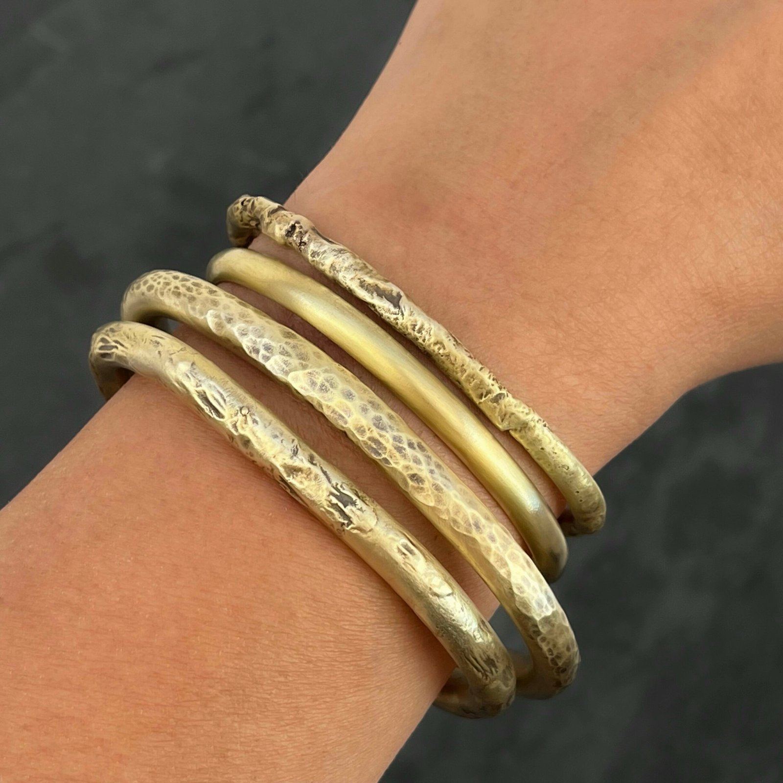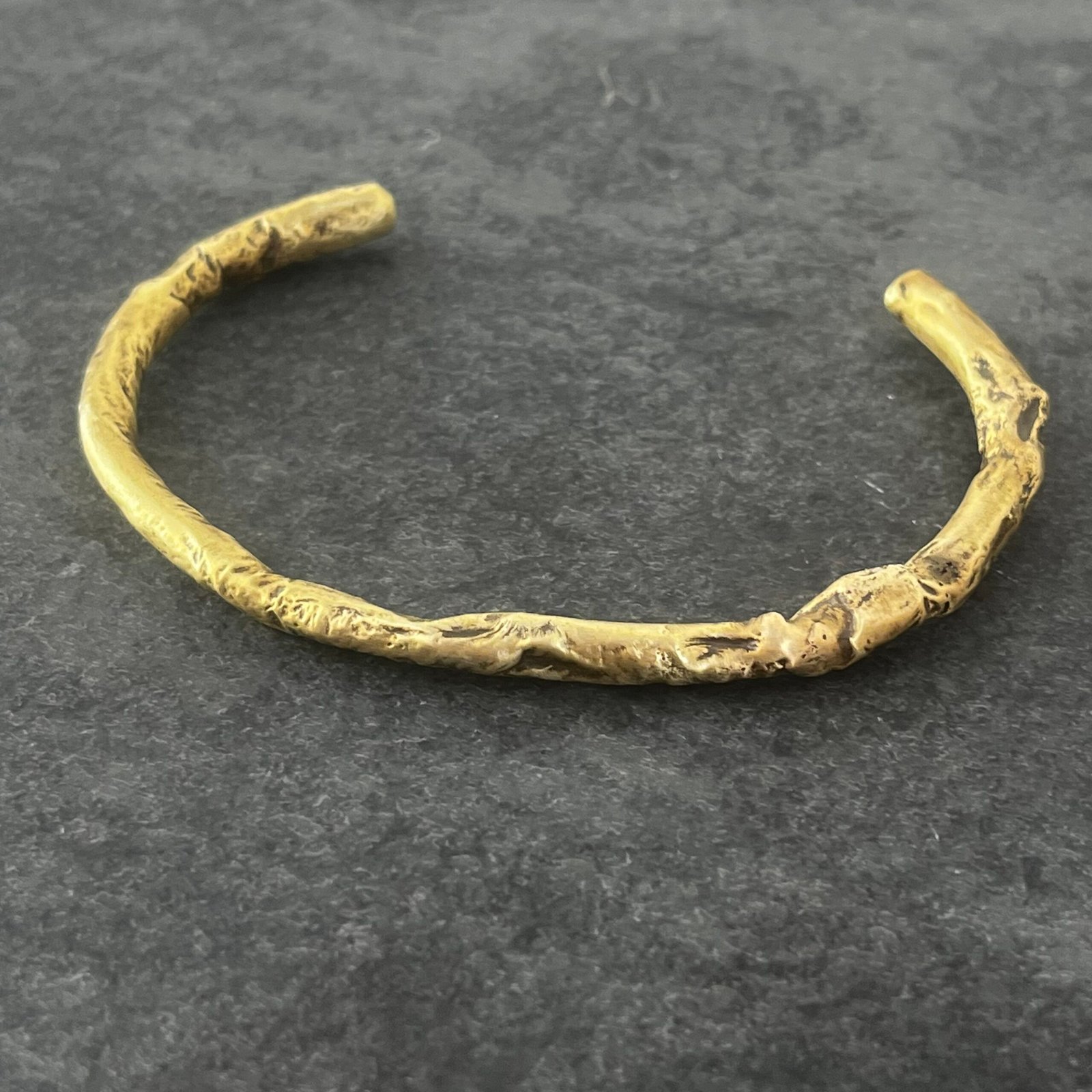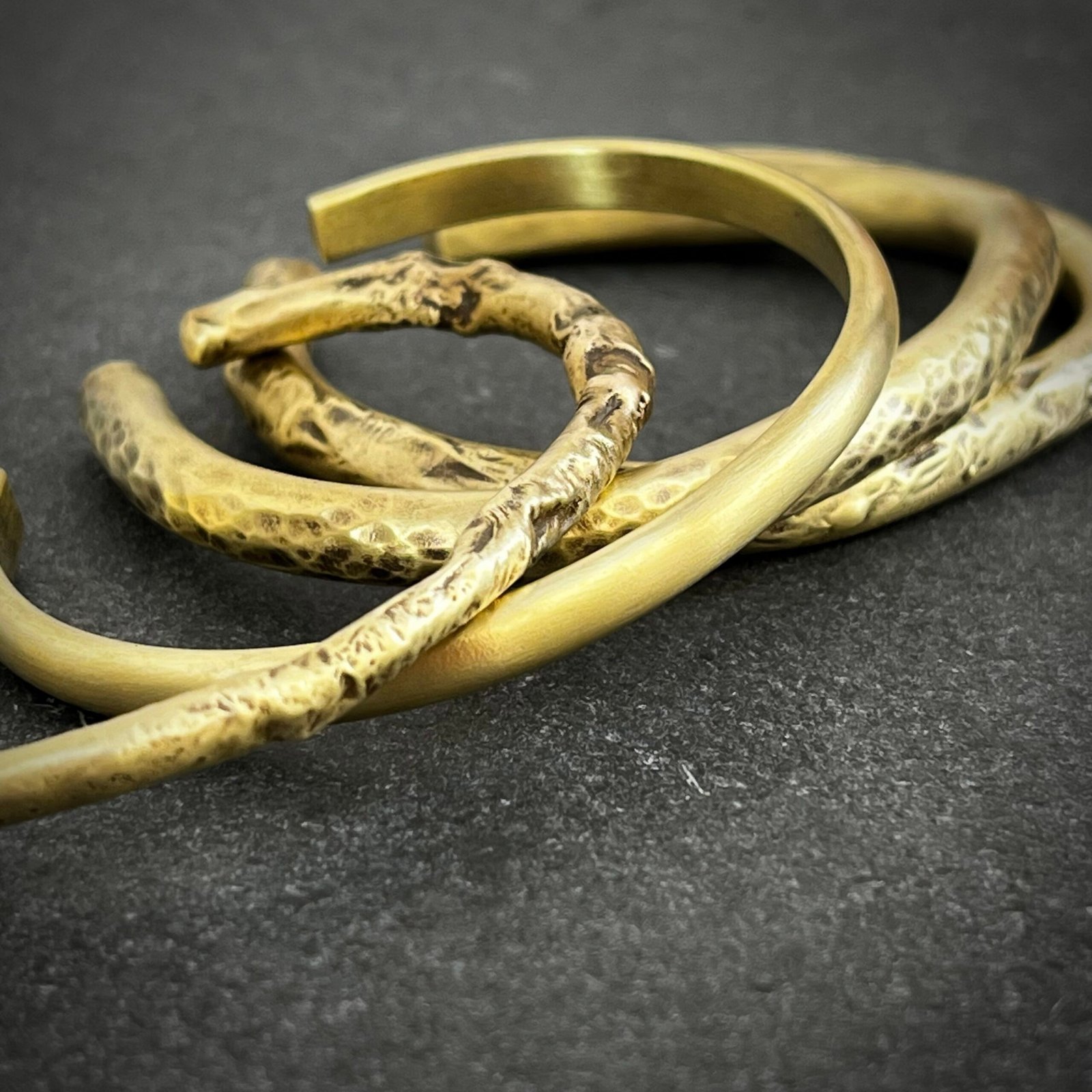 «Nacidos del calor extremo y la fuerza del metal, los Brazaletes Elementales celebran la belleza de lo imperfecto. Cada pieza es forjada artesanalmente en bronce, un metal que evoluciona con el tiempo, adquiriendo una pátina única según quien lo viste.