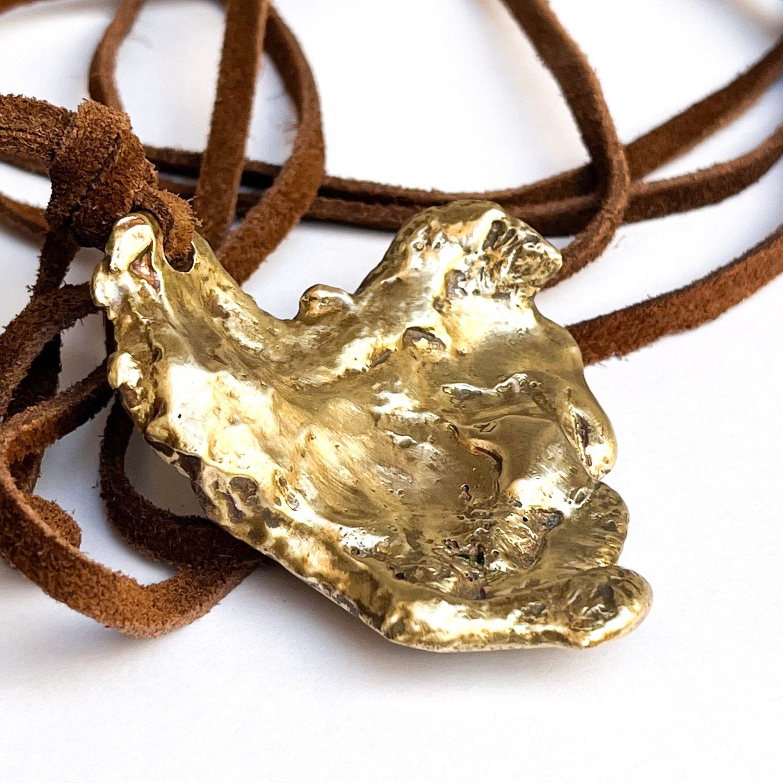 «Collar de autor con pieza central de bronce modelado a fuego directo. Un diseño escultural y orgánico con texturas únicas nacidas del calor del soplete, montado sobre una cinta de gamuza café. Una pieza con alma y carácter, hecha a mano por Macarena Ravioly.»