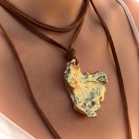 Esta pieza celebra lo imperfecto y lo salvaje de la naturaleza. El colgante de bronce sólido se suspende de una cinta de gamuza en color café moro, ofreciendo un contraste cálido y una caída natural. Es un diseño pensado para quienes buscan llevar una escultura portable que conecte con la energía de la tierra y el fuego.»
