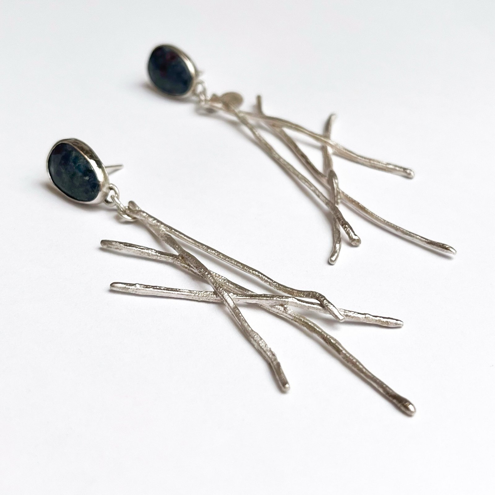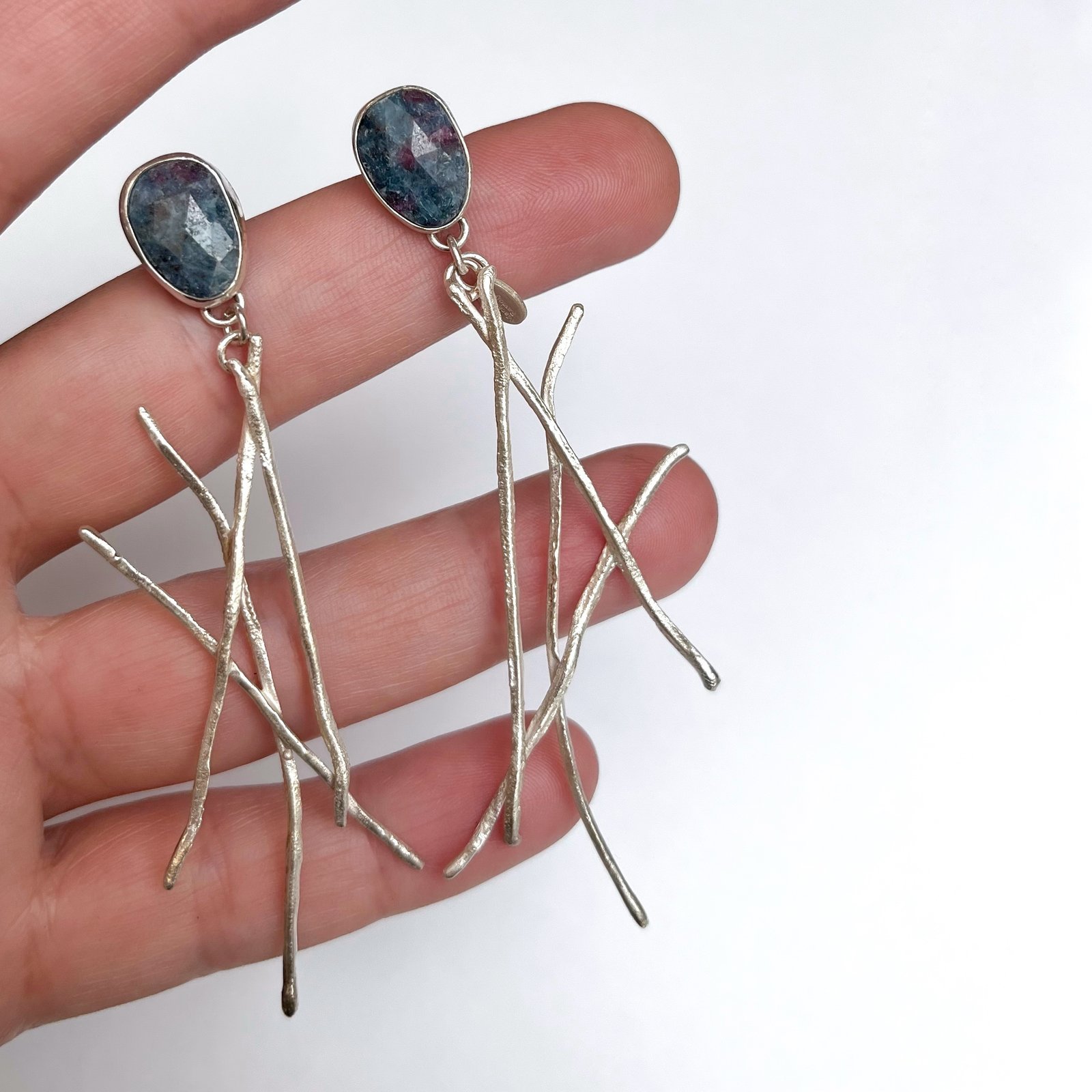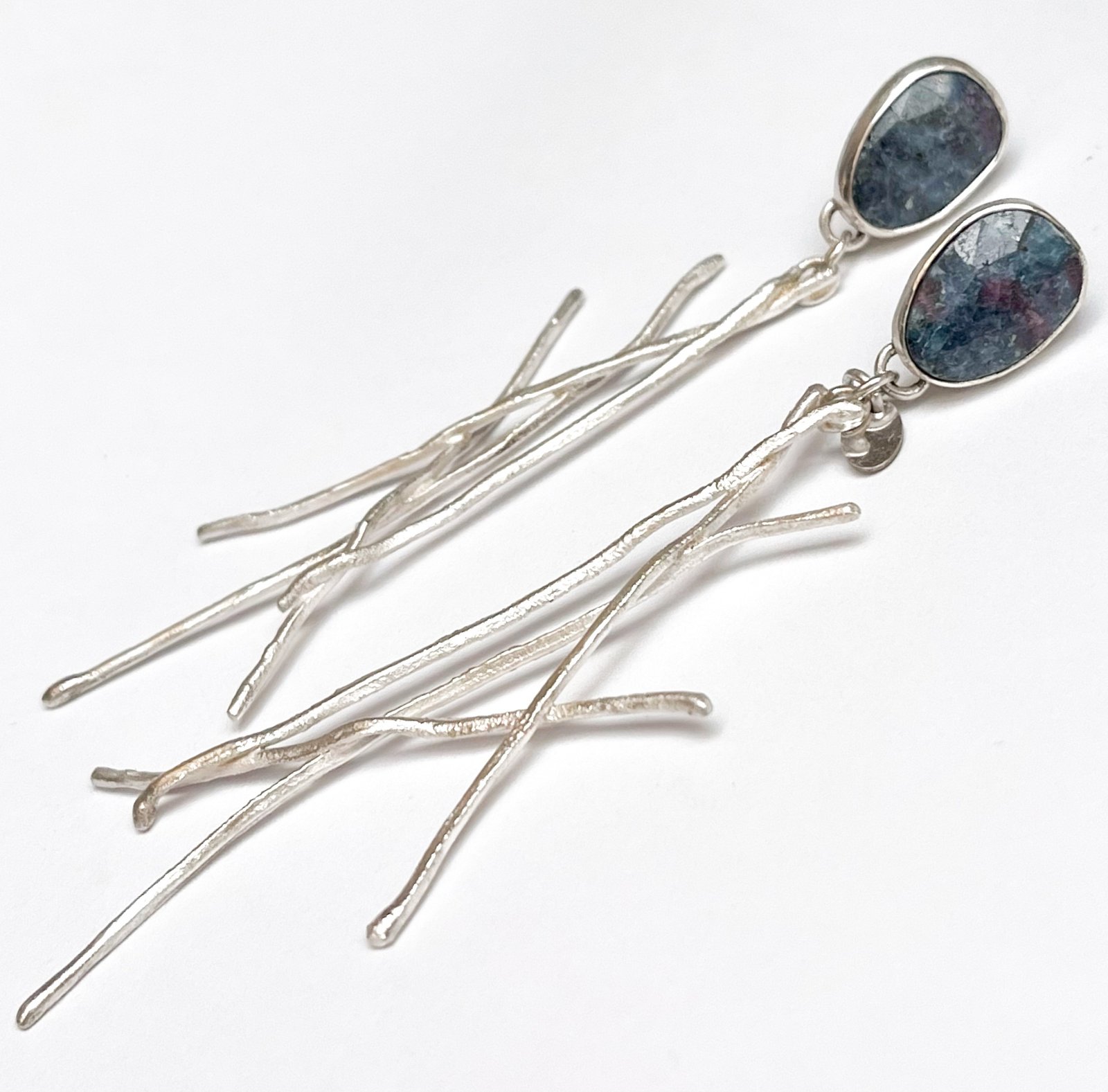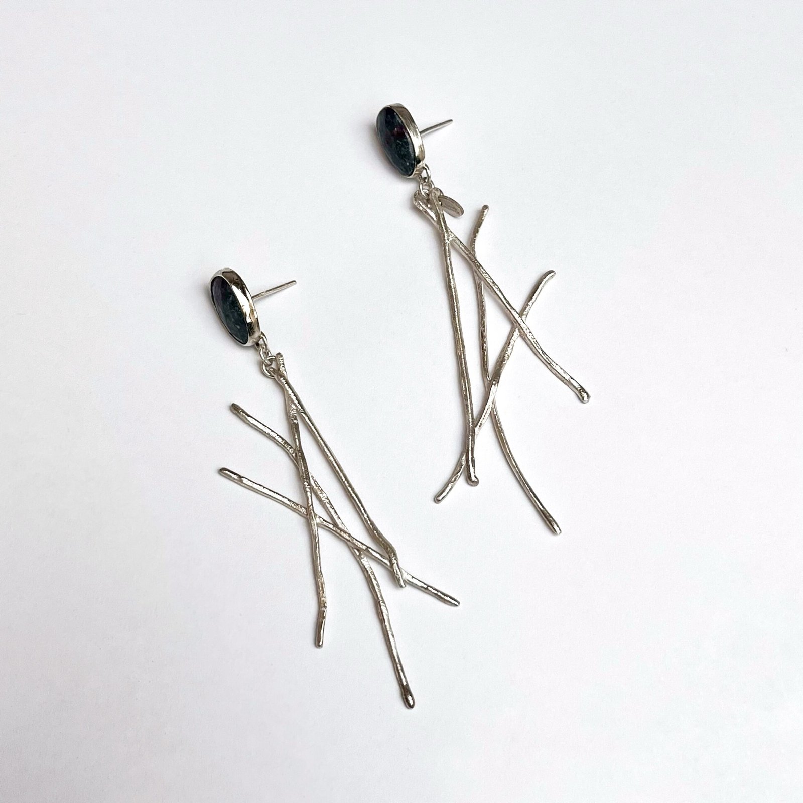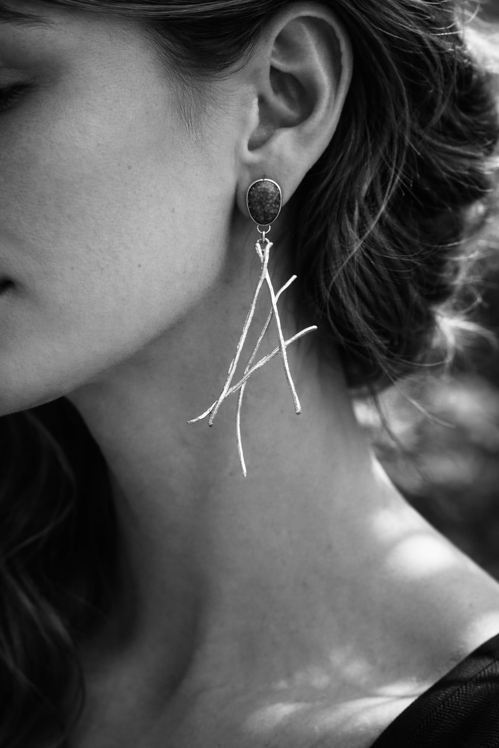 «El arte se encuentra con el fuego. Estos aros son una composición orgánica de trazos de plata 950, texturados a fuego directo para otorgarles esa identidad cruda y viva que define mi trabajo. Buscando capturar la fluidez del movimiento, los hilos de metal parecen pinceladas atrapadas en el viento, creando una escultura contemporánea que danza con cada paso.