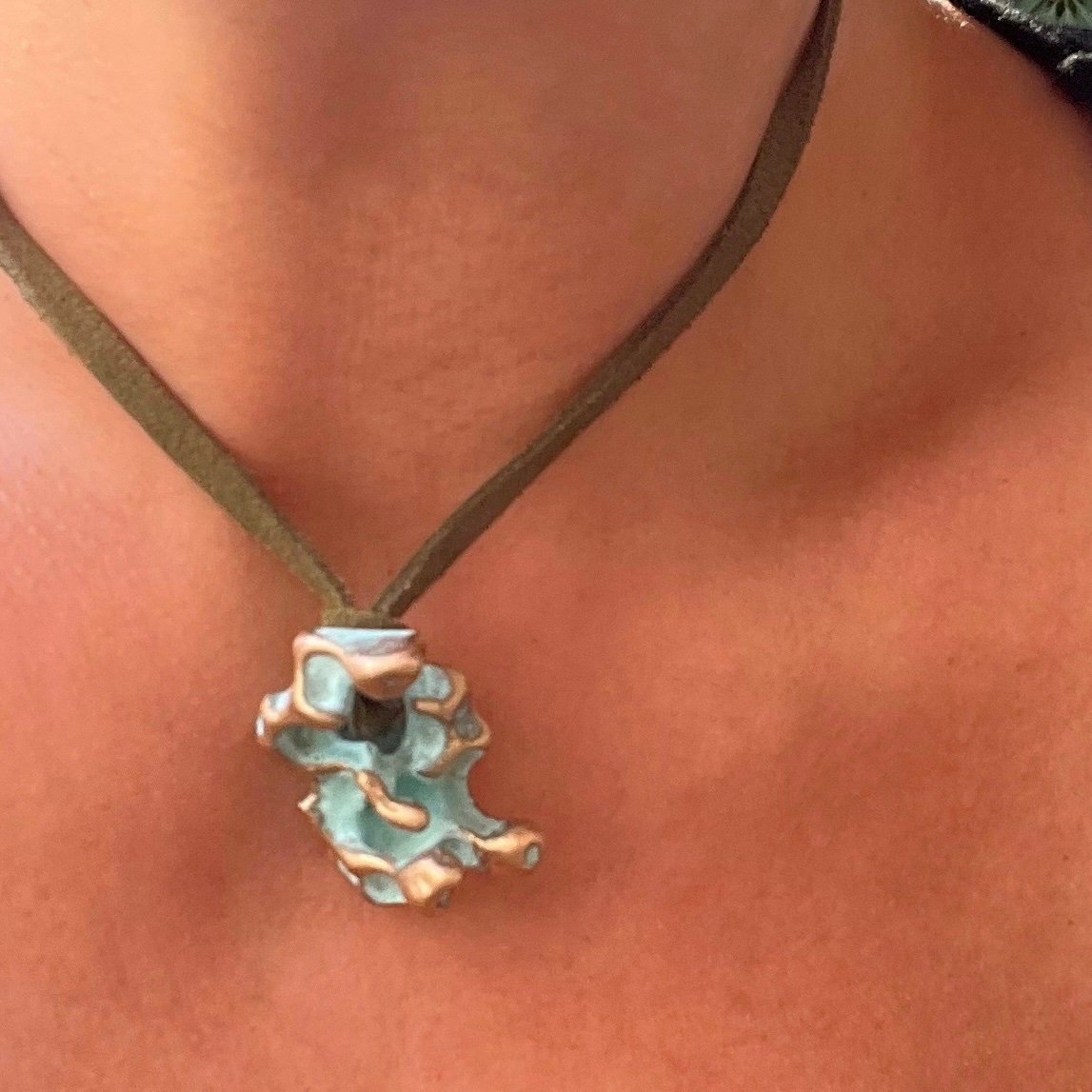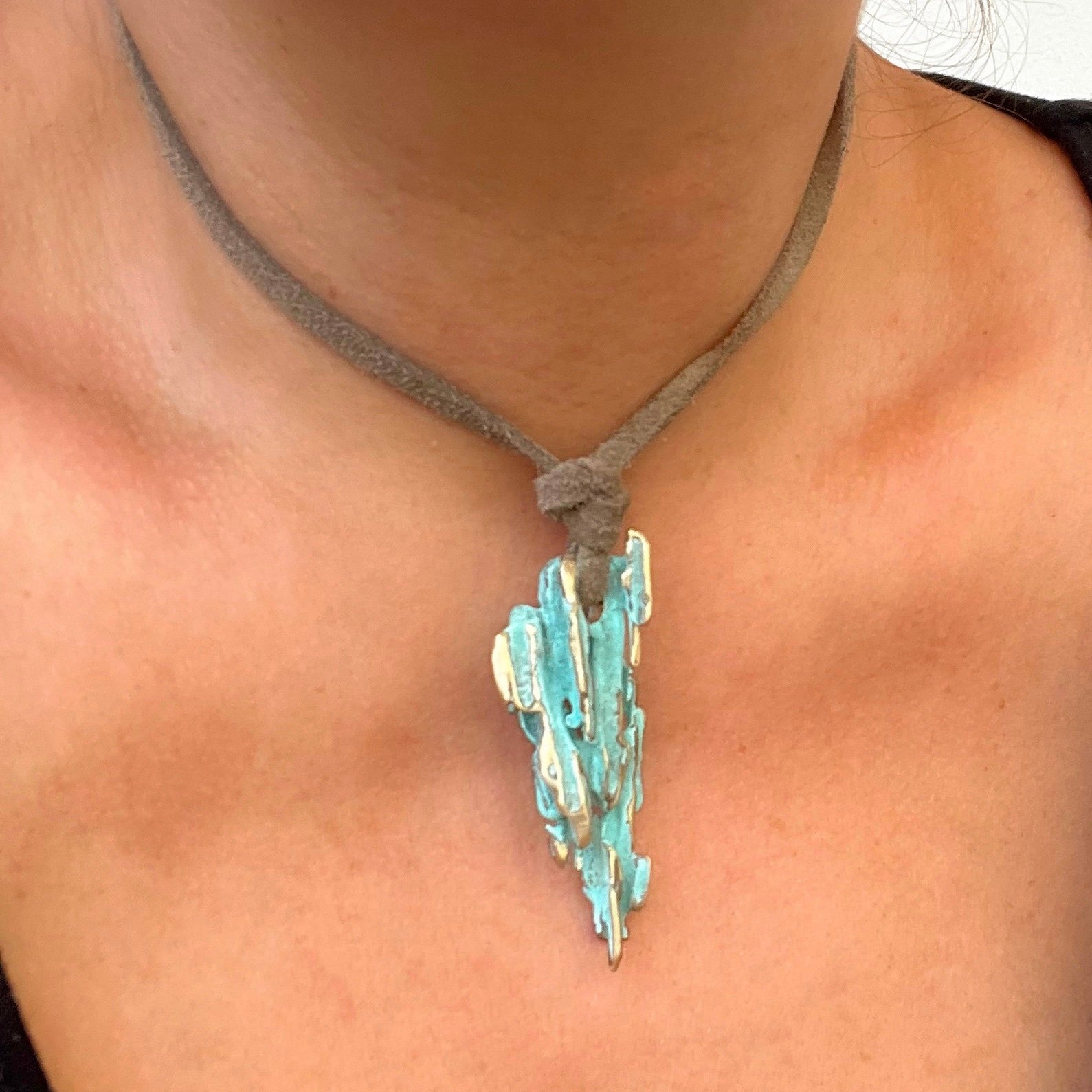«El Collar Estados del Agua es una exploración artística sobre cómo el movimiento y la temperatura transforman la materia. A través del uso del bronce y las pátinas artesanales, recreo la morfología del agua en dos escenarios fascinantes: