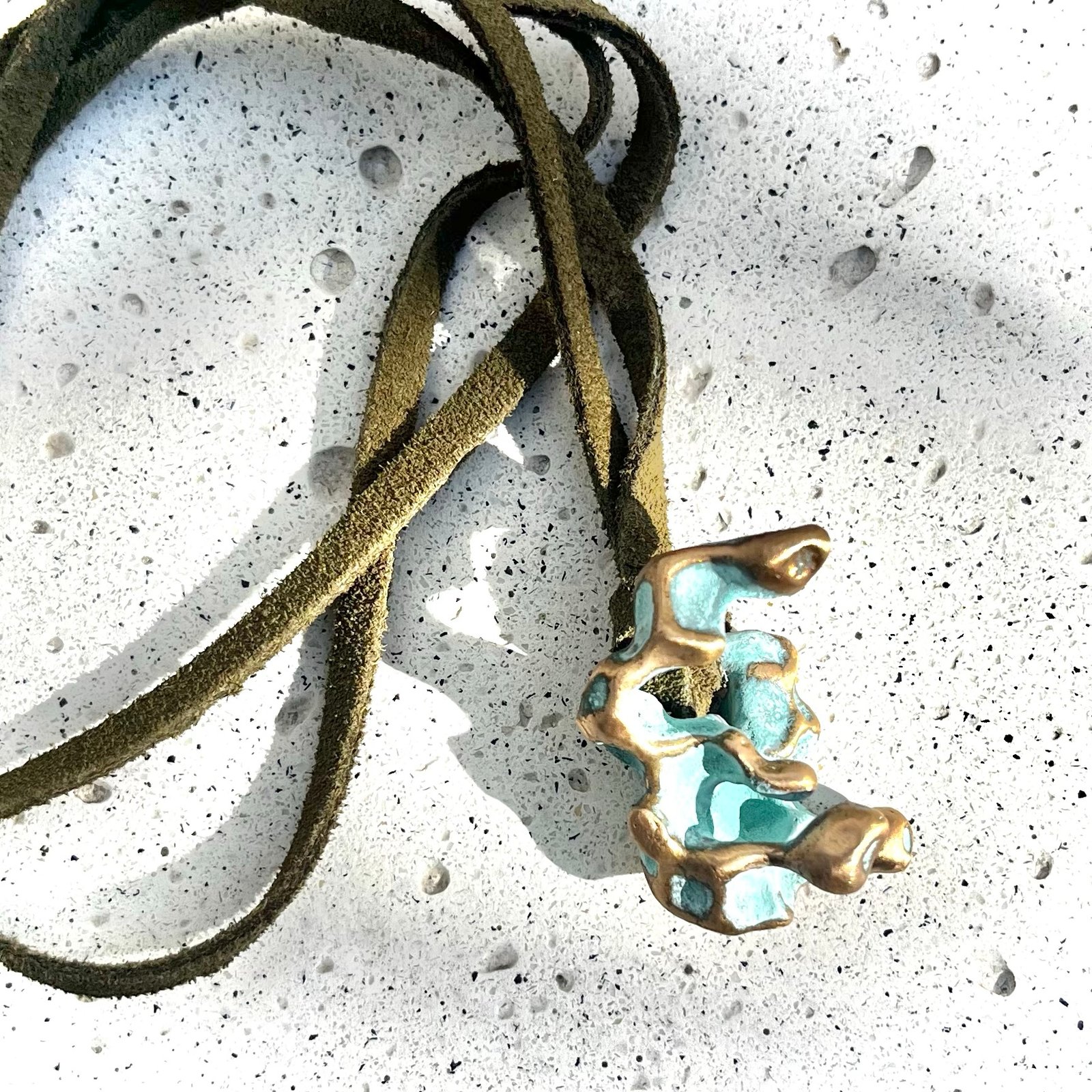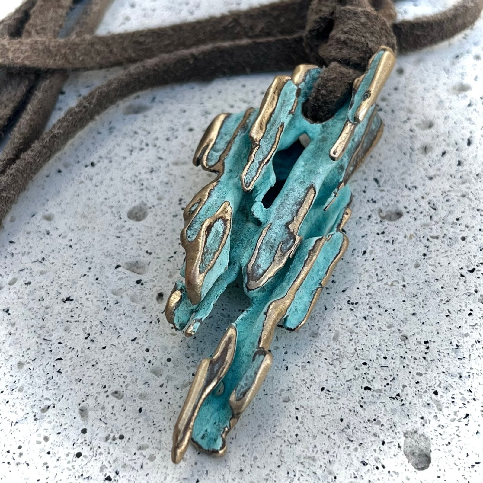 Variación Estalactita: Formas alargadas y gélidas que evocan el agua congelada en cuevas milenarias. Sus tonos calipsos sobre el bronce sugieren la transparencia del hielo puro.