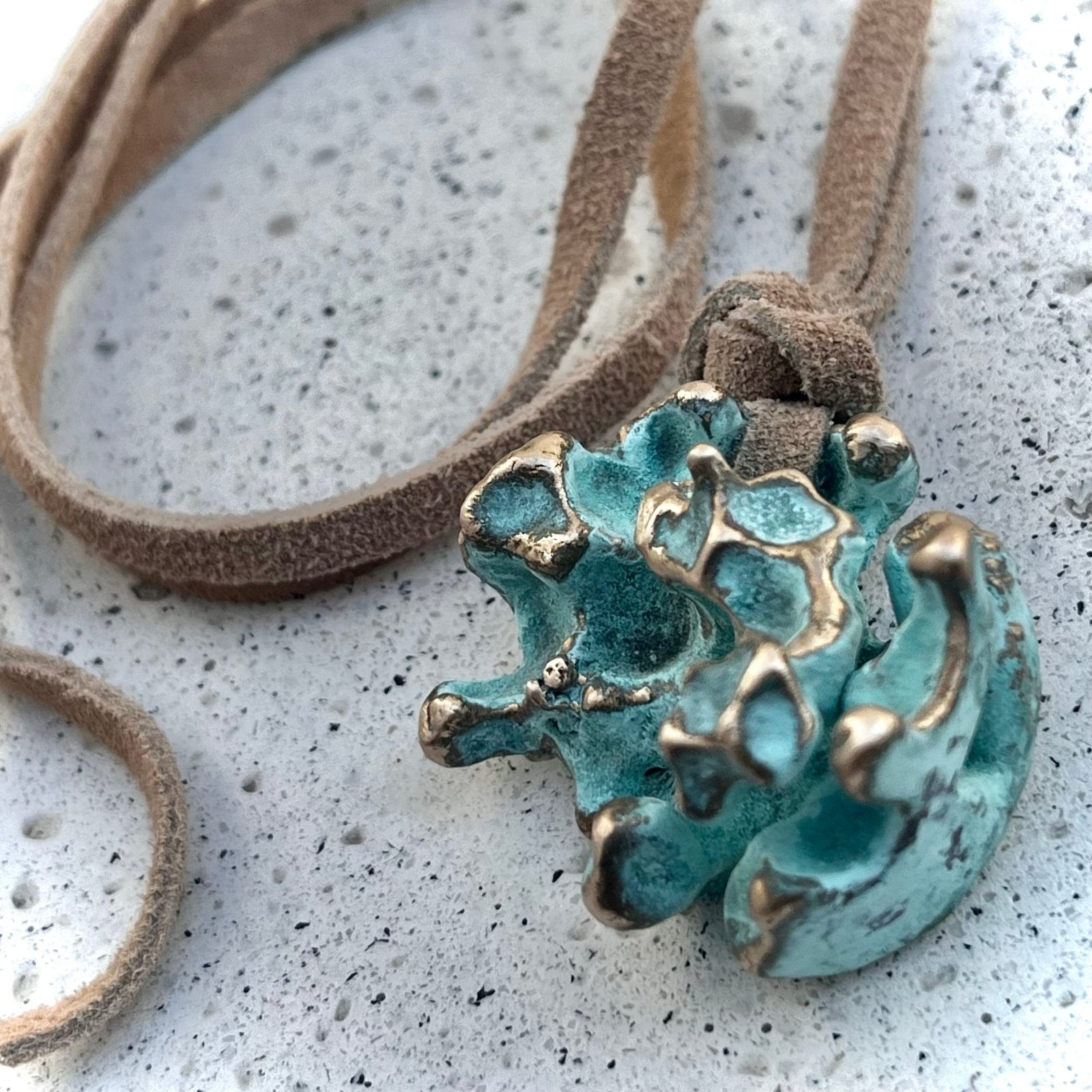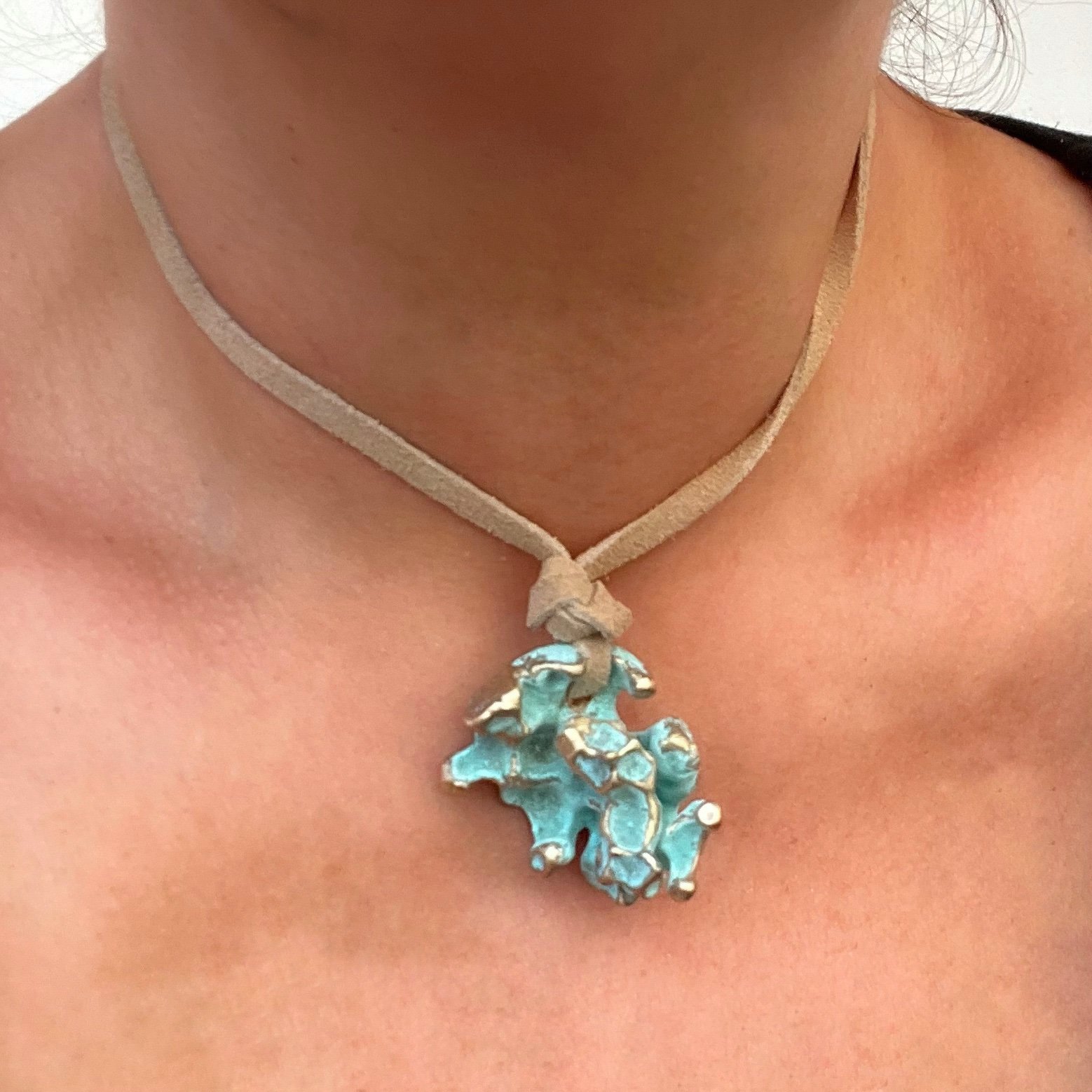 Ambas versiones cuelgan de una cinta de gamuza en tono neutro, permitiendo que la pieza central- una explosión de color y textura- sea protagonista absoluta. Una joya para quienes ven en los accesorios una extensión de la naturaleza.»