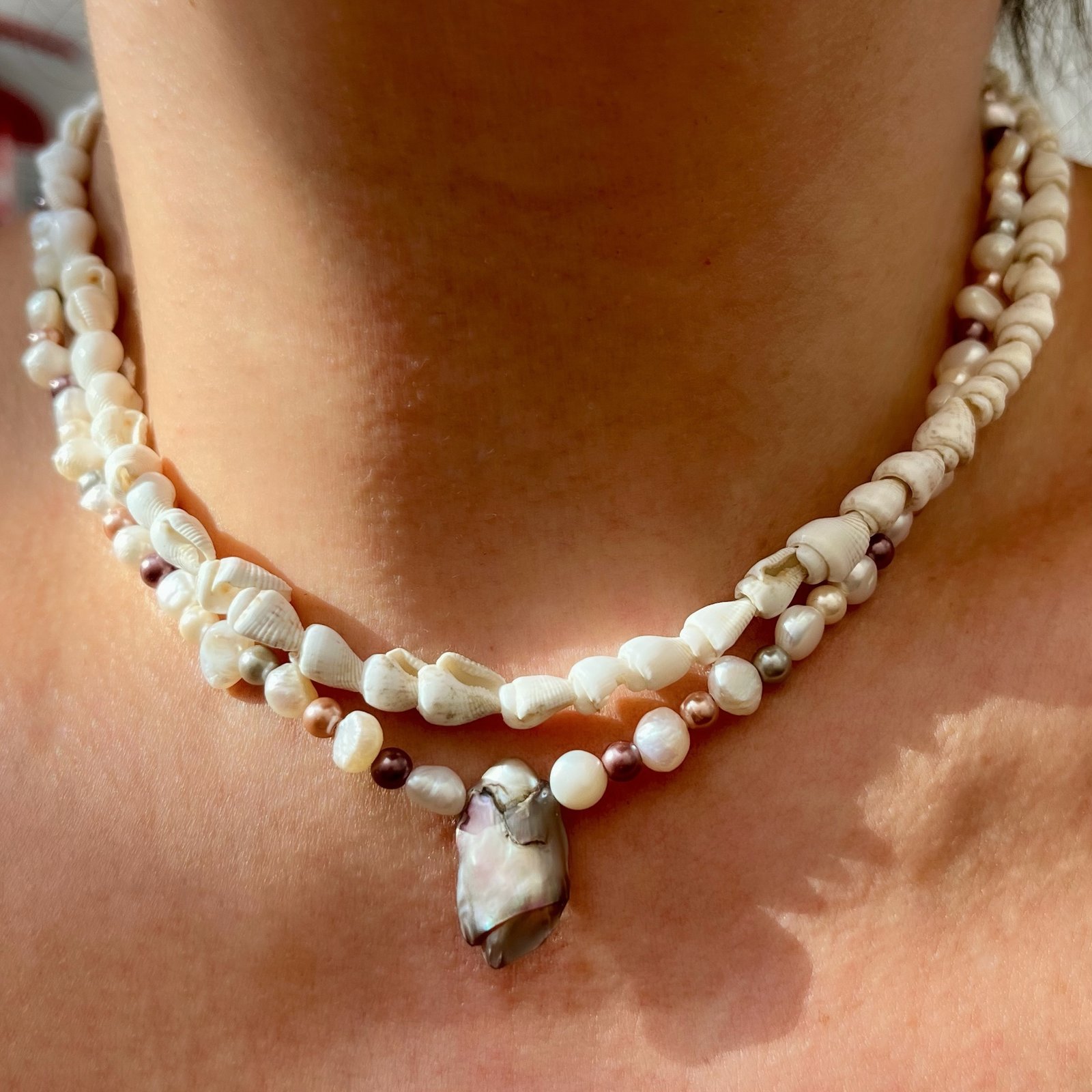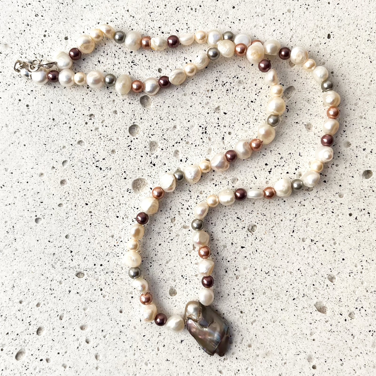 El centro de la pieza lo protagoniza una perla barroca, elegida por su forma única y su brillo profundo, que cuelga como un amuleto orgánico. Finalizando con un broche de plata, este collar es la unión perfecta entre la tradición de las perlas y el diseño contemporáneo de autor. Es una joya luminosa, pensada para resaltar la elegancia natural de quien la lleva.»