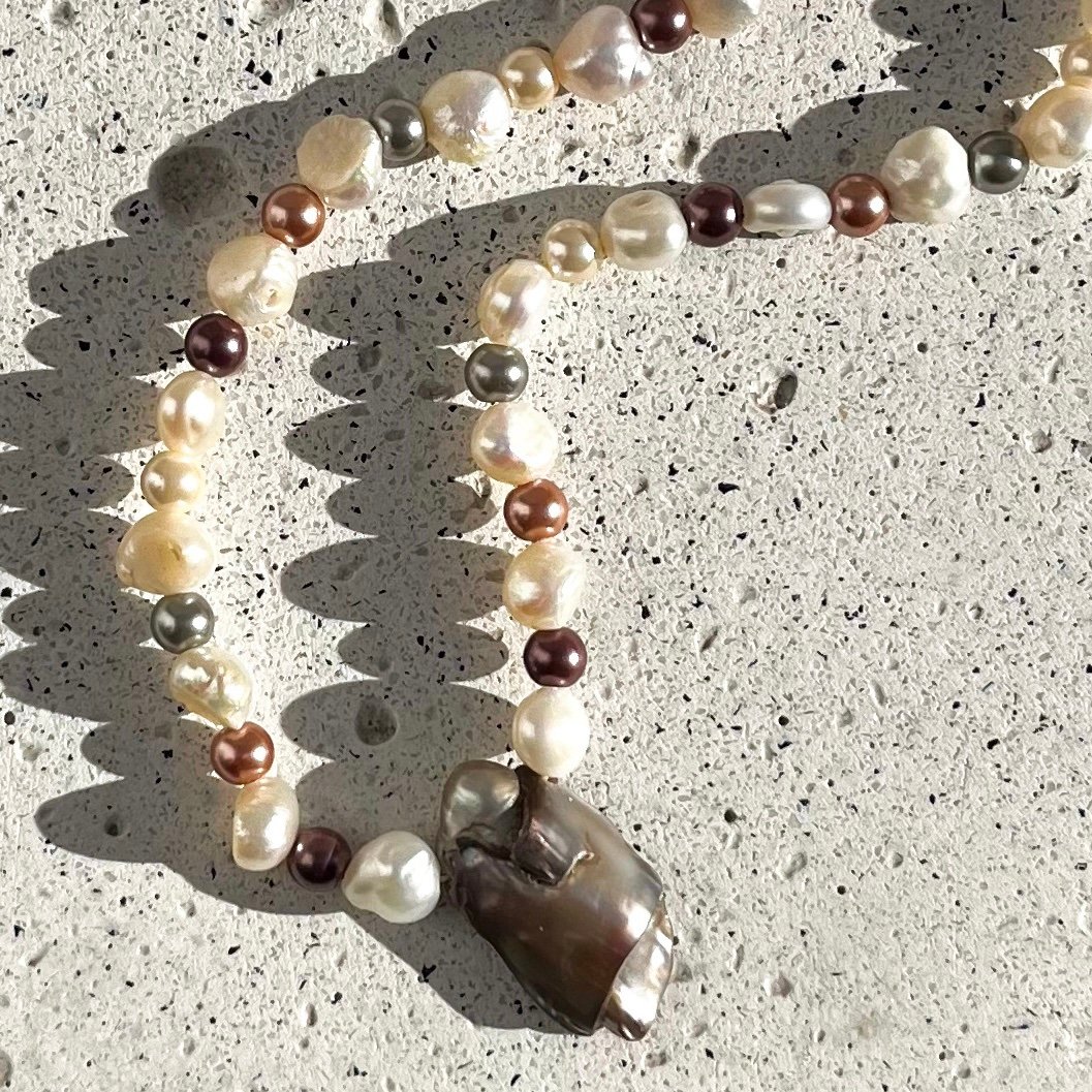 «El Collar Tesoro Barroco es una pieza que celebra la belleza de la imperfección natural. Diseñado con una selección de perlas de río y perlas shell en sutiles matices crema, cobrizos y grises, este collar crea un juego de luces y texturas sumamente elegante.
