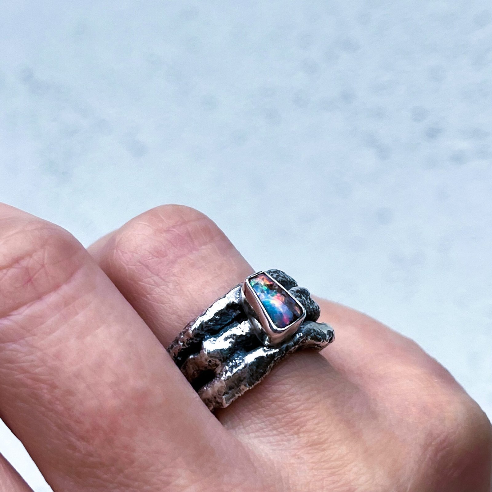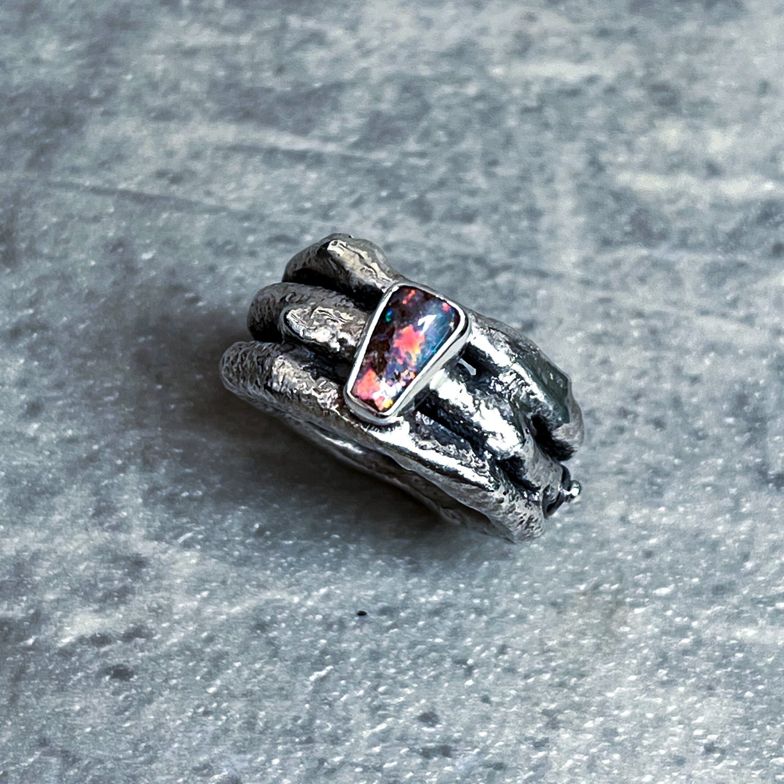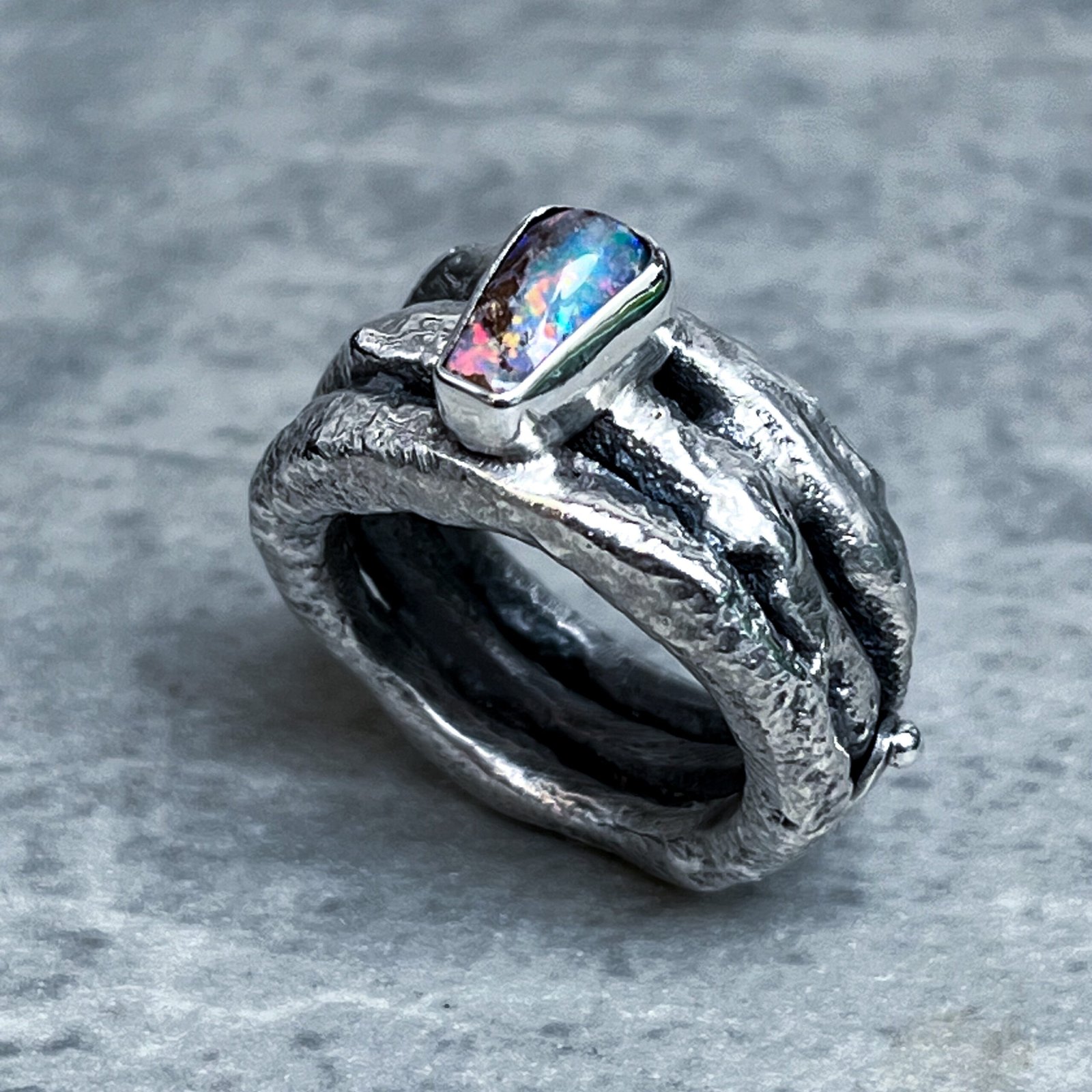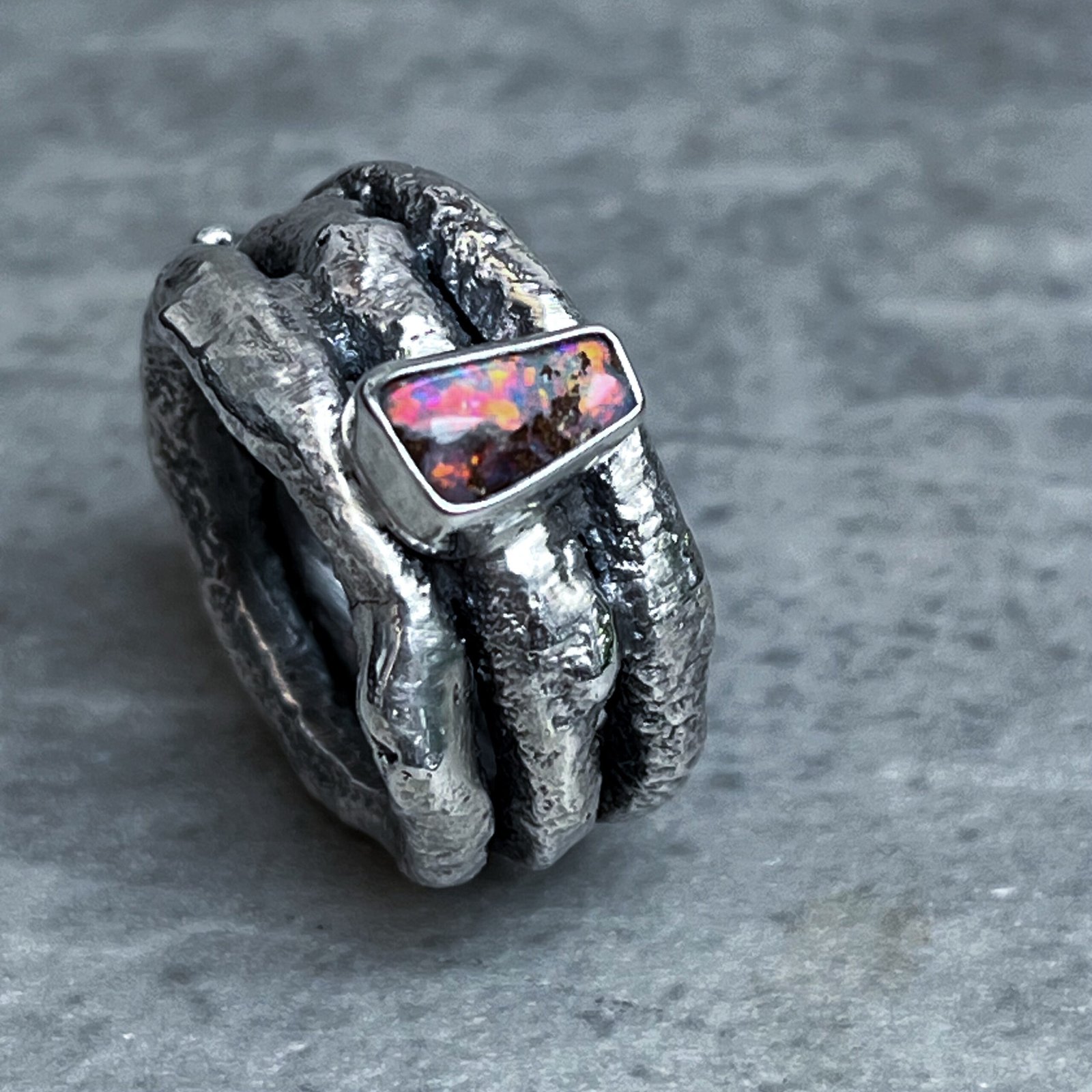 «Anillo robusto de plata 950 hecho a mano con textura orgánica y pátina leve. Protagonizado por un Ópalo Boulder Australiano con destellos rosados, lilas y verdes. Pieza única de diseño exclusivo.»